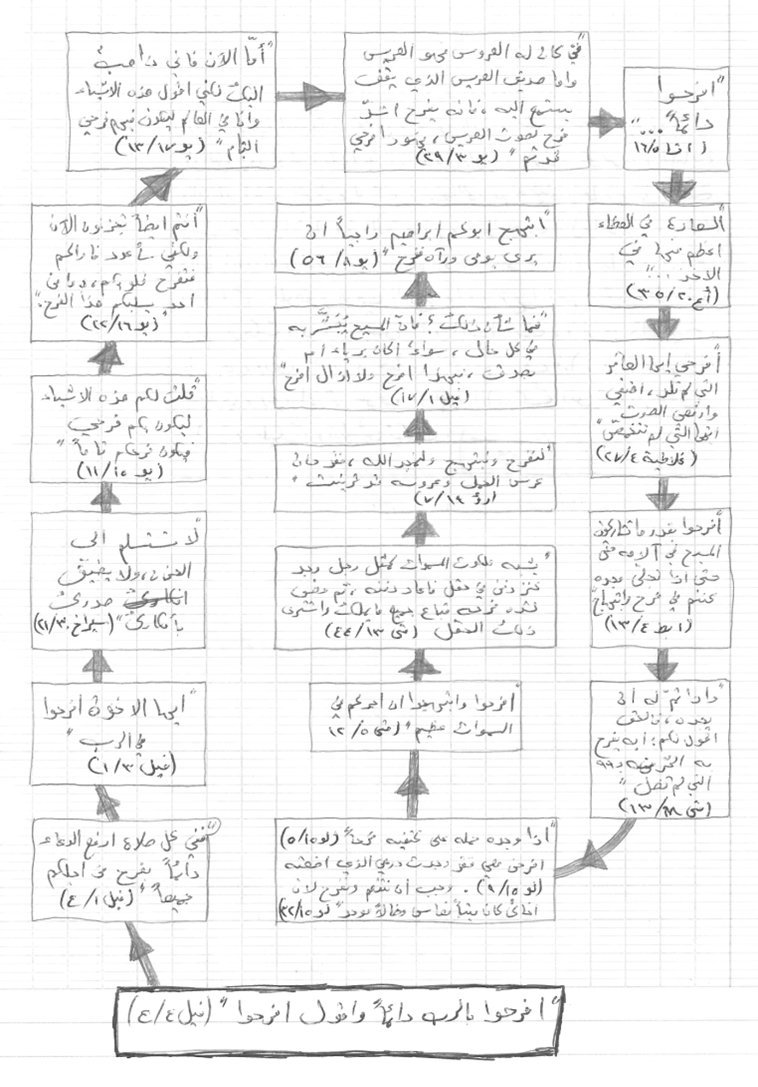 عمليًّا: ينطلق القارئ أو فاحص الكلمة من آيةٍ محدّدة يكتبها على الورقة ومنها يتنقّل في كلّ الكتاب من آيةٍ إلى أخرى - بحسب الشواهد - كاتبًا إيّاها مع التعليق الشخصيّ على كلّ آيةٍ، بالإضافة إلى رسم الأسهم المشيرة إلى خارطة المسيرة التي تتبّعها حتّى وصل إلى آيةٍ محوريّة يتوقّف عندها لقراءة مسيرة حياته والصلاة.